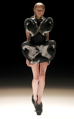 Iris van Herpen’s style is inspired by the combination of craftsmanship and innovative materials. Metallic silk, polyamidic powder and smoked leather are the ingredients of her sculptural and futuristic silhouettes which are startingly rich in contrast. The Spring/Summer collection 2012 seems to defy gravity in its play with amorphous shapes, which truly seem to originate from another planet. This fascinating show intrigued the invited guests, including celebrities like Mo Asumang, Monika Griefhahn, Karoline Herfurth, Hannah Herzsprung, Annabelle Mandeng, Rita Serra-Roll, Bruno Spengler and Verena Wriedt.