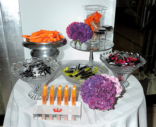 On entering the venue, guests were ushered through a 10 year retrospective gallery celebrating 10 years of Rimmel and Kate Moss. Rimmel usherettes, dressed in regal red military jackets, led guests into the main space to join the party goers. Guests drank signature Rimmel cocktails named after blockbuster products including Extra Wow (Gin, lemon, apple and elderflower), Glam Eyes (Vodka, blackberry and violet) and Max Gloss (Mango, lime, ginger beer), ate bespoke British canapés such as London Pride battered cod and chunky chips, homemade old spot pork pies and mini bakewell tarts, whilst large screens posted Kate’s dramatic helicopter entrance as well as live tweets from VIP guests throughout the evening.